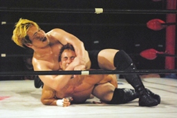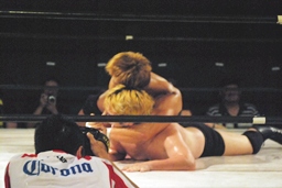 ロックアップ(右写真)、諸橋がロープに押し込む、ブレーク。