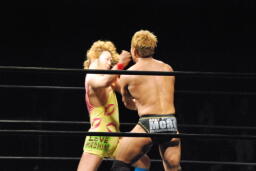 ロープワーク、諸橋ヒップトス、急所クロー狙うが福田は下からキック。福田立ち上がるとヒザ蹴り、サミング(左写真)。