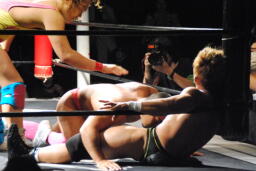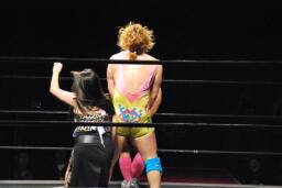 諸橋マメと入れ替わる、福田急所蹴り、マメにヒット(左写真)。