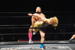 諸橋腕をひねる、福田切り返してヘッドロック、諸橋ロープに振る、福田ショルダーブロック(右写真)。