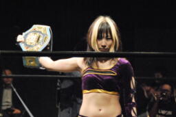 ICE×60ベルトを持って入場、紫雷美央(右写真)。昼間アイス後楽園で初防衛したばかり。