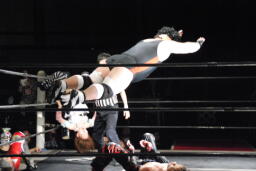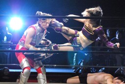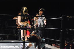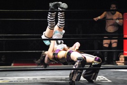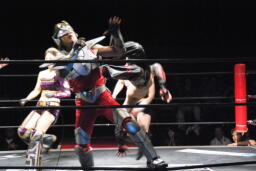 凛音ムーンサルトプレス、美央かわす、凛音着地、ロープに飛ぶ、美央は紫閃光(左写真)、イサミにタッチ。