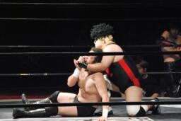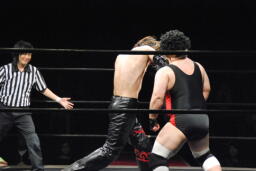 ロープに飛んで勇脚・斬(左写真)、カウント3。