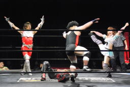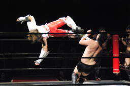 けんとみおがダブルでロープに振る、都クローズラインかわして2人にラリアット(右写真)。