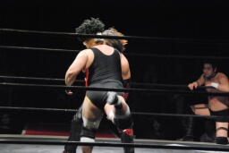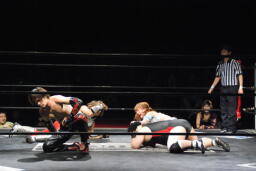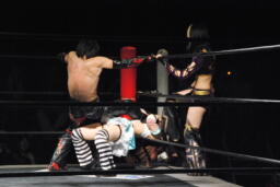 イホが大家をリングに入れフェースロック(左写真)、大家ロープ。イホストンピング、ボディスラムからカバー、カウント2。コーナーに詰めてショルダータックル、凛音にタッチ。
