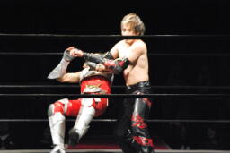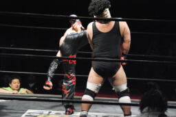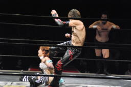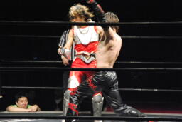 イサミがその背中にドロップキック(左写真)、場外戦に。