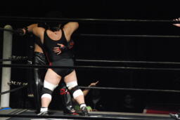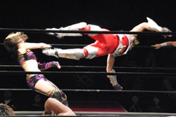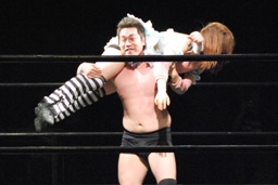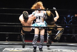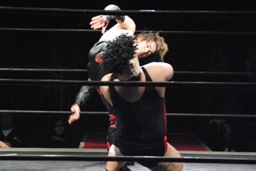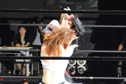 大家が都をエプロンに戻しブレーンバスター狙う(右写真)、都ブロック。