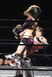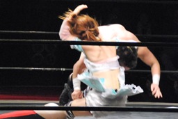イホボディスラム、コーナーに上ってダイビングボディプレス(左写真)、美央がカット。