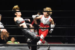凛音「コスモを燃やせよ!」と檄を飛ばしチョップ、ロープに振ってドロップキック(右写真)。都にタッチ。