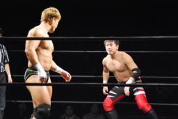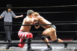 先発は諸橋と妻木(右写真)。ロックアップ、諸橋ロープに押し込む、ブレーク。