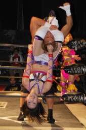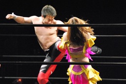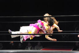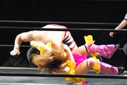 諸橋ヘッドロックから崩してクリップラー・クロスフェース(左写真)、美央カット。中島が美央を場外に出す。