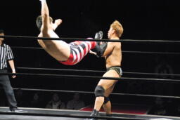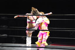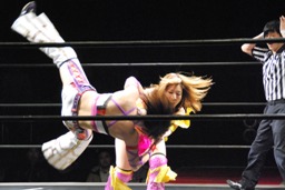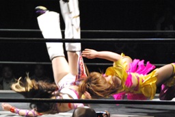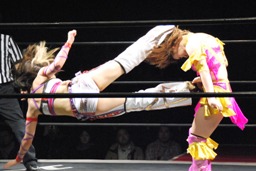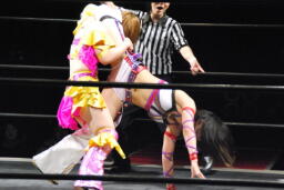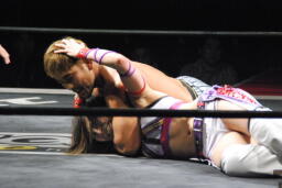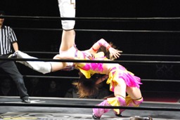 美央ロープに飛ぶ、中島キャッチしてブロックバスターホールド(右写真)、カウント2。