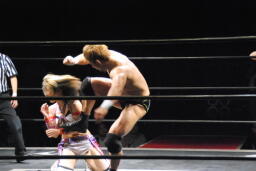 妻木コーナーに振る、諸橋切り返して突っ込む、妻木カウンターのキック、正面跳びドロップキック(右写真)。諸橋は中島にタッチ。
