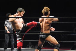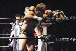 コーナーに振って串刺しエルボー、ランニングローキック(右写真)、カウント2。10分経過。