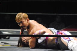 手四つから力比べ、中島ロープに飛んでクロスボディ(右写真)。