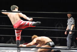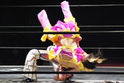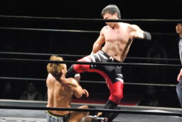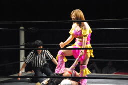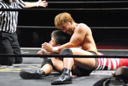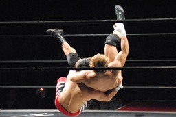 妻木ソバット、バックドロップ(左写真)、カウント2。