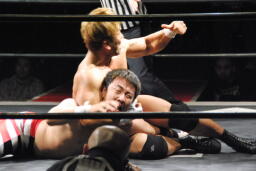 中島ロコモーションダブルアームスープレックス(右写真)、カウント2。ストンピング、諸橋にタッチ。