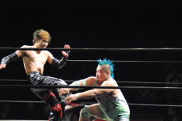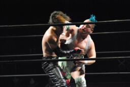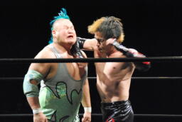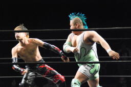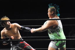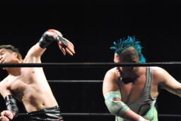 エルボー打ち合い(右写真)、イサミボディスラム狙う、入江ブロック。