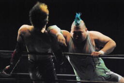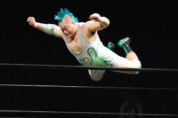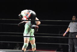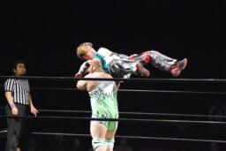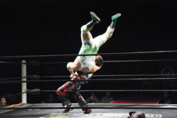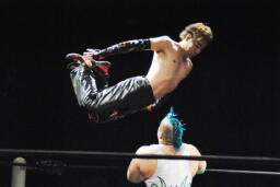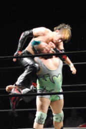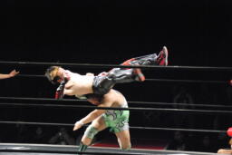 肩に担ぐ(右写真)、イサミ着地。両者場外転落。イサミひな壇席の前で入江をボディスラム、階段上るとダイビングニードロップ。リングに戻す。10分経過。