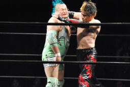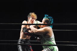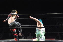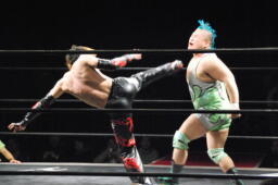 イサミ場外でガットショット、エルボー(左写真)、入江も打ち返す。両者リングに戻る。