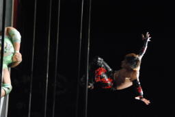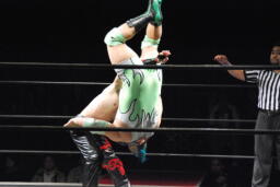イサミロープに飛ぶ、入江キャッチしてブラックホールスラム、イサミブロックして(左写真)着地。