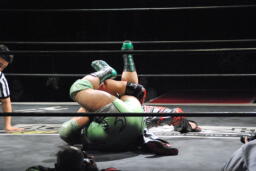 入江が突っ込んでくるところをイサミ丸め込んで首固め(右写真)、入江カウント2で返す。