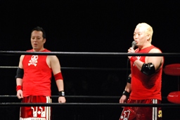 イホを呼び込むとヤスにダブルのガットショット、ロープに振ってダブルの逆水平(右写真)、