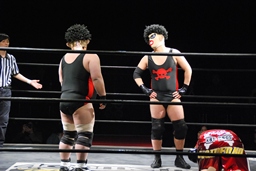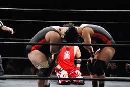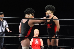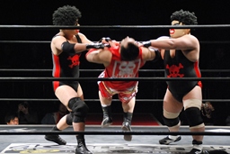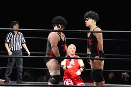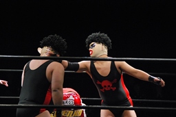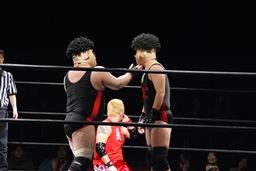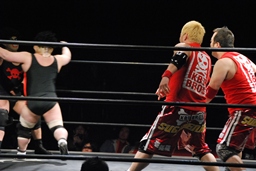 ヤスソバット、イホ足を取る(右写真)、ヤス延髄蹴り、ヒデにタッチ。