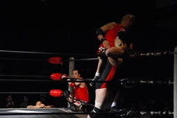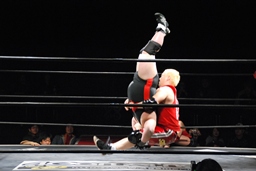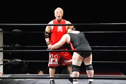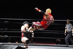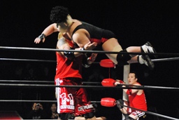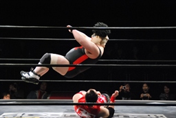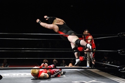 コーナーに上ってフロッグスプラッシュ(右写真)、ヤスがカット。