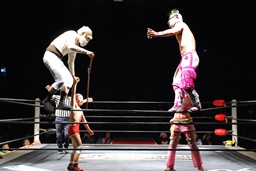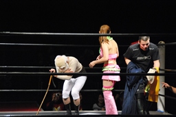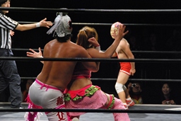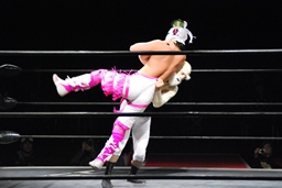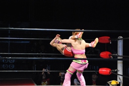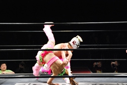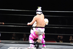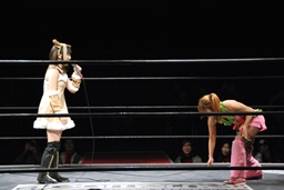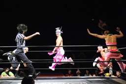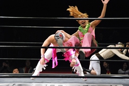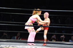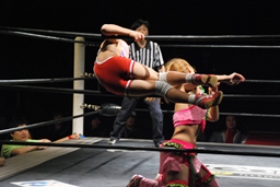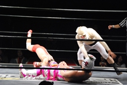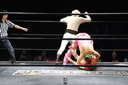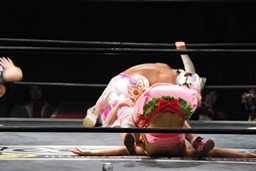チェリーは38パンチ、38キック、そして38クラッシャー(右写真)、カウント2。じいちゃんにタッチ。5分経過。
