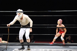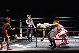 じいちゃんリングに戻ってチョークスラム狙うが(右写真)親父はホイップで切り返す。親父ダブルフットスタンプ、カウント2。