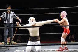 6号のローキックでじいちゃんダウン(左写真)。6号にブーイングが起きる珍しい事態。
