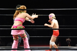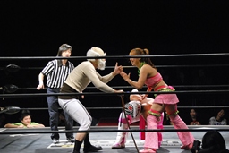 そこに高梨マサ子(左写真)。「しばらく私が出てない間にユニオン女子どうしちゃったの!?アンタたち、それはお客さんに見せたいものなの!?アタシたちがお客さんに見せなきゃいけないのは試合ですばらしい闘いをして、お客さんに感動伝える。それが使命じゃないの?」