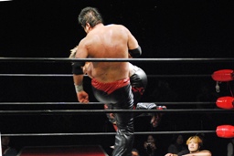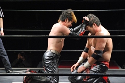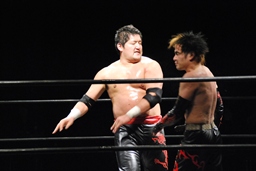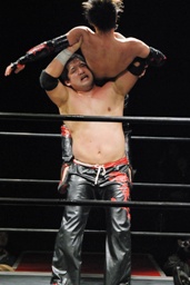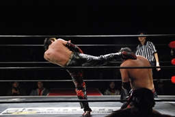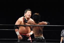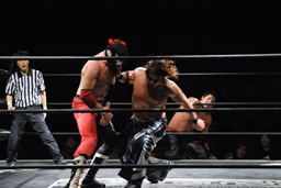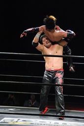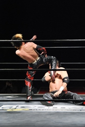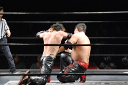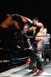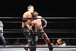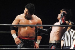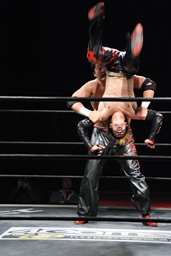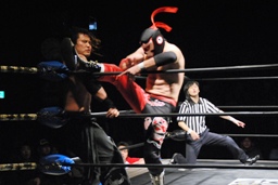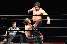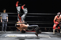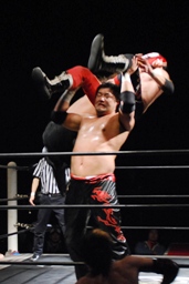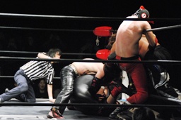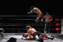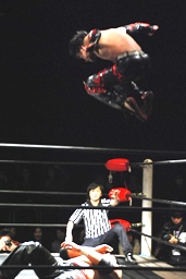 石川がジェネリコを肩車に捕え、大家がコーナーから飛んでダブルインパクト(左写真)、