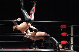 石川抱え上げてファイヤーサンダー、カウント2。再度スプラッシュマウンテンの体勢(左写真)、