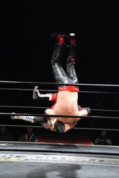 コーナーに上ってダイビングニードロップ(左写真)、大家がカット。