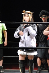 次いで選手が一言ずつ。竜「ショアッ!来年早いうちに復帰して弁護士レスラーになりたいと思います。」(右写真)