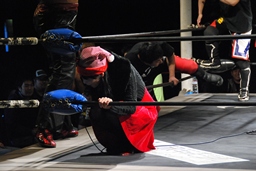 大家がカバー、イサミがコーナーからのダイビングニードロップでカット(右写真)。両軍タッチ。25分経過。