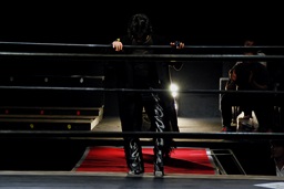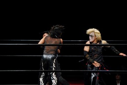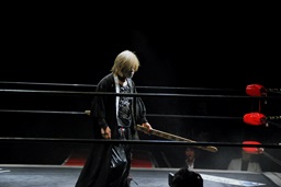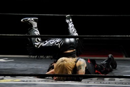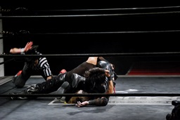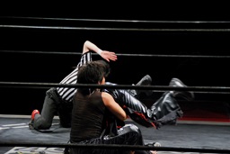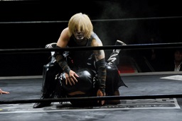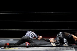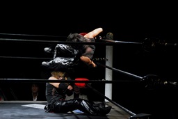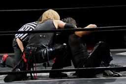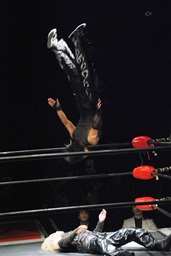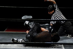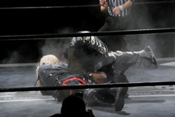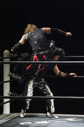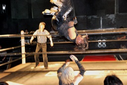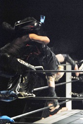 ロープワーク、怨霊バック取ってロープに押し込むと後方回転エビ固め(左写真)、MIKAMIがキックアウトすると怨霊はその勢いで場外転落。
