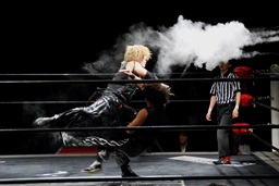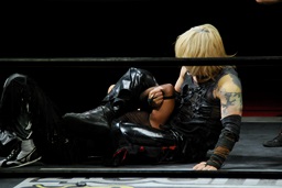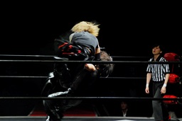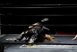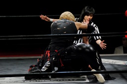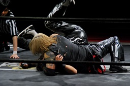 MIKAMIエビ固めに(右写真)、カウント2。怨霊ニースタンプ。5分経過。