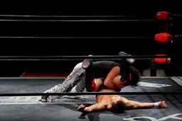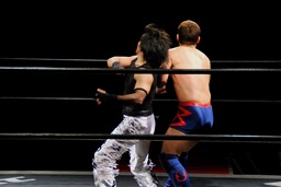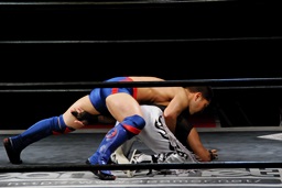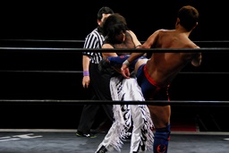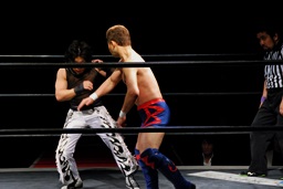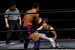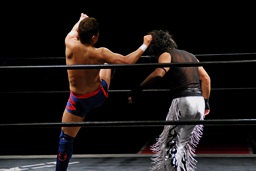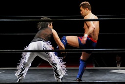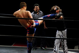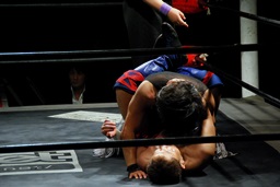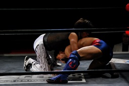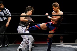 ダウンしたMIKAMIの顔面を蹴り上げる(左写真)、MIKAMI場外エスケープ。臼田場外に降りてMIKAMIをリングに戻す。