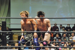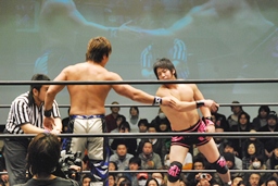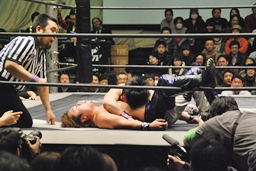 カウント2でHARASHIMAが足をロープに(左写真)。ここでタイムアップ。
