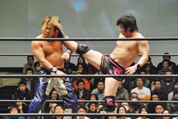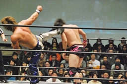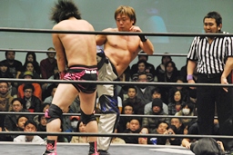 石井タイガースープレックス狙う、HARASHIMAブロックしてソバット(右写真)。
