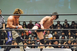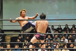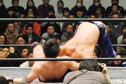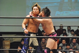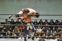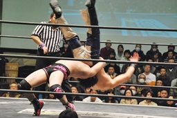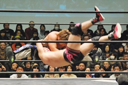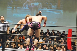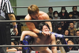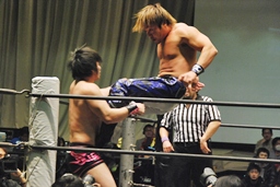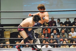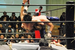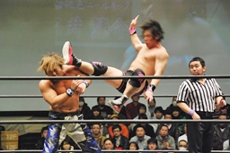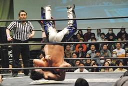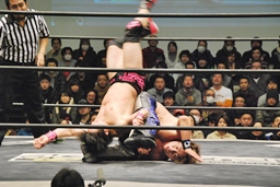 HARASHIMA山折り狙って?肩に担ぐ、石井DDTに切り返す(右写真)、カウント2。
