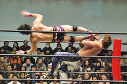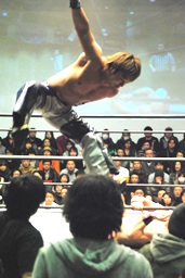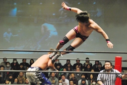 石井コーナーに上る、HARASHIMAも上って雪崩式ブレーンバスター狙うが石井はエプロンに飛び降りてターンバックルへのDDT、再度コーナーに上ってミサイルキック(左写真)、カウント2。