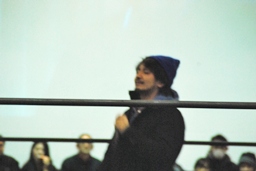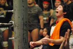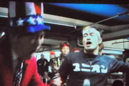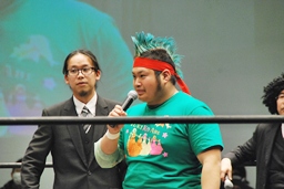 前説。今成組(仮)の正式ユニット名が決まったということで鶴見亜門GM「今成組(仮)の3人、上がってきて!」しかし上がってきたのは今成リーダーのみ(右写真)。で、正式決定したユニット名は「ゴールデンらんでぇぶぅ」。「らんでぇぶぅ」は新大久保の今成リーダーが大好きなお店の名前から。リンクは張らないので興味のある人は各自検索を。