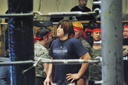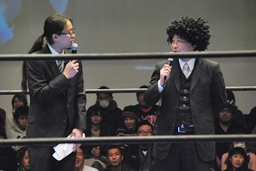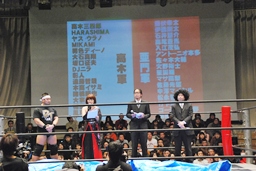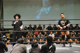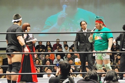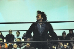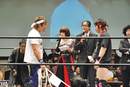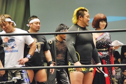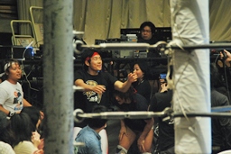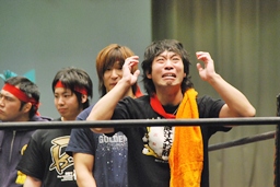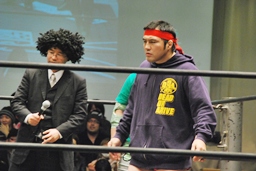 「X」となっていた高木軍の16人目について大社長「Xは見つかりませんでしたが、昼から後楽園にいたら、いい感じの人が見つかりました。」現れたのはなんとジュニア二冠王の近藤修司!これは意表を突く人選。近藤はリングに上がって大社長と握手(右写真)。