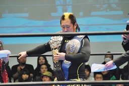 ジュニア二冠のベルトを肩から掛けた近藤、「なんで1日じゅう後楽園にいなきゃいけないのかまだわかってませんが、せっかく大社長からオファーを受けたので。」(左写真)