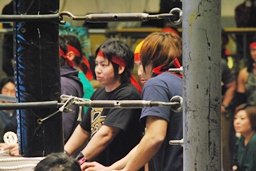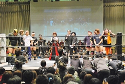 メイン5vs5シングルマッチの対戦カードを決める綱引き開始(左写真)。