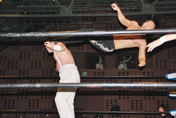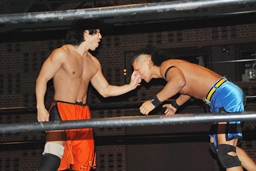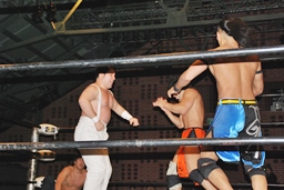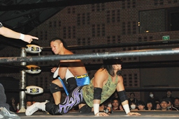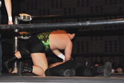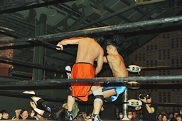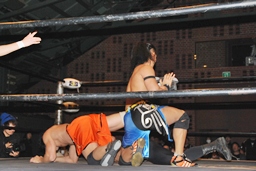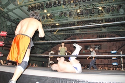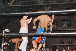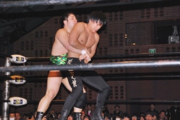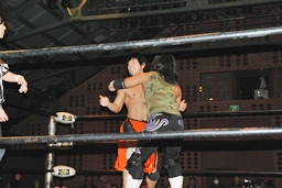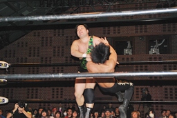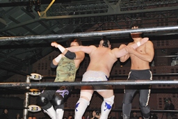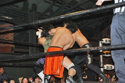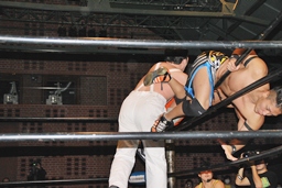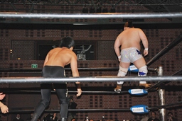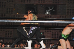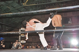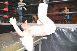 伊橋ボディスラム、後ろ向きにコーナーに上る(右写真)、遠藤後ろからドロップキック、伊橋場外転落し失格。
